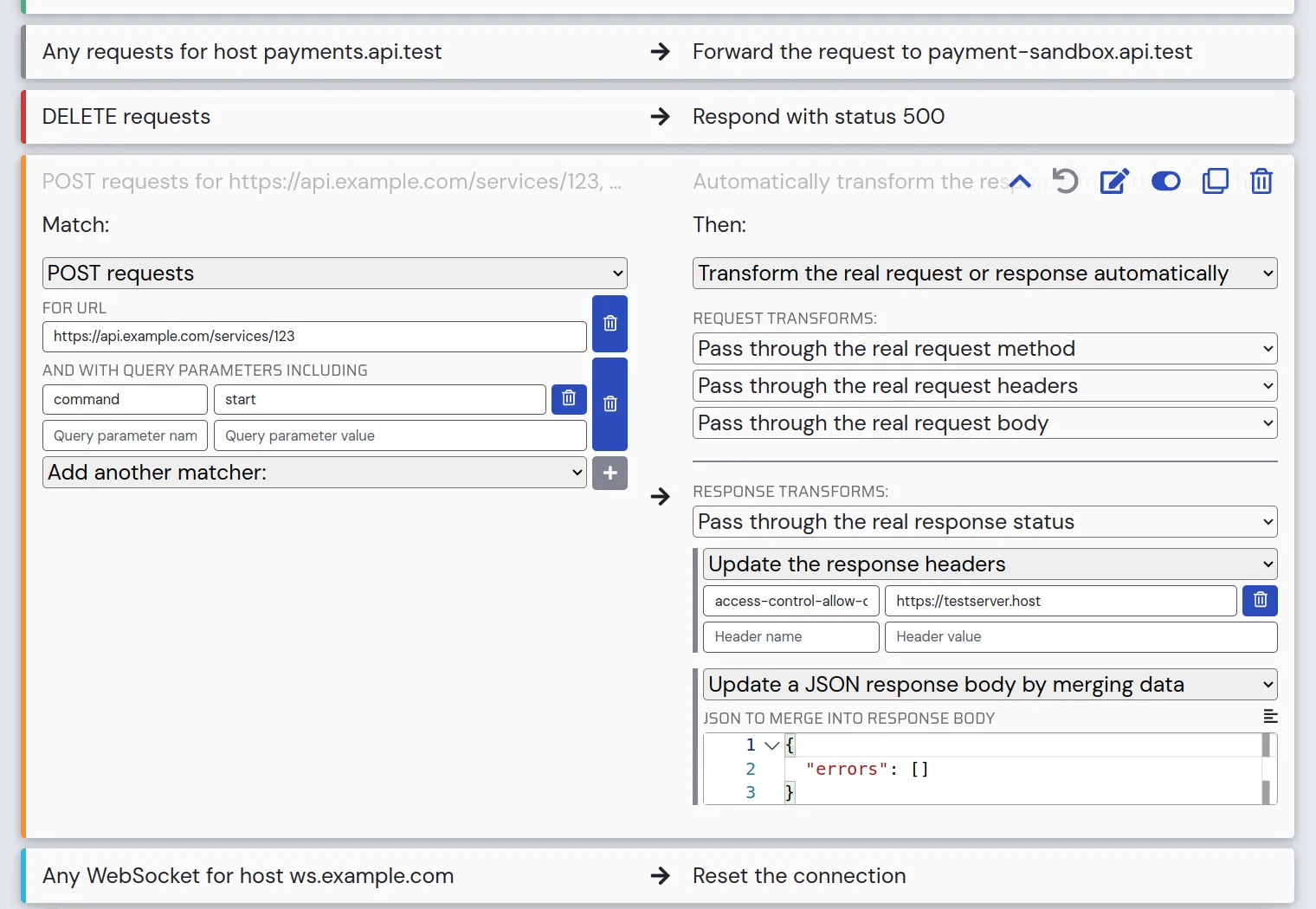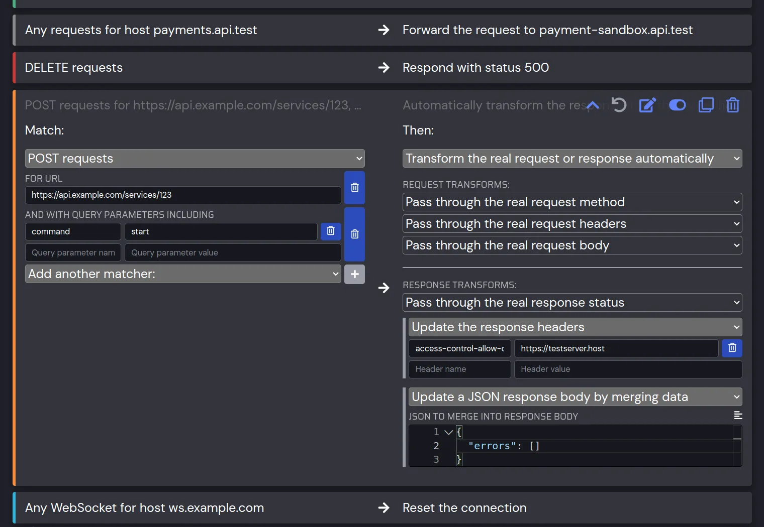 Redirect production sites to local test servers, or block requests with connection resets, timeouts & failing status codes. Want a real response from a target server, but different? Dynamically transform requests or response to inject headers (goodbye CORS errors), match/replace body content, patch JSON bodies, and more.