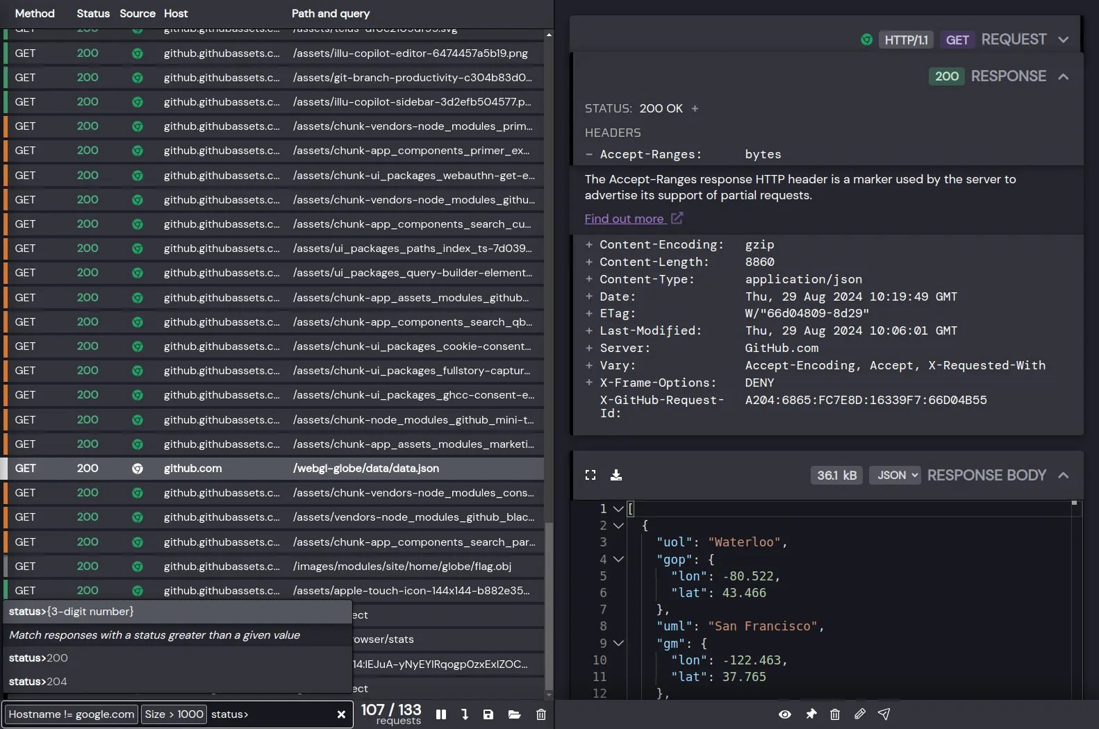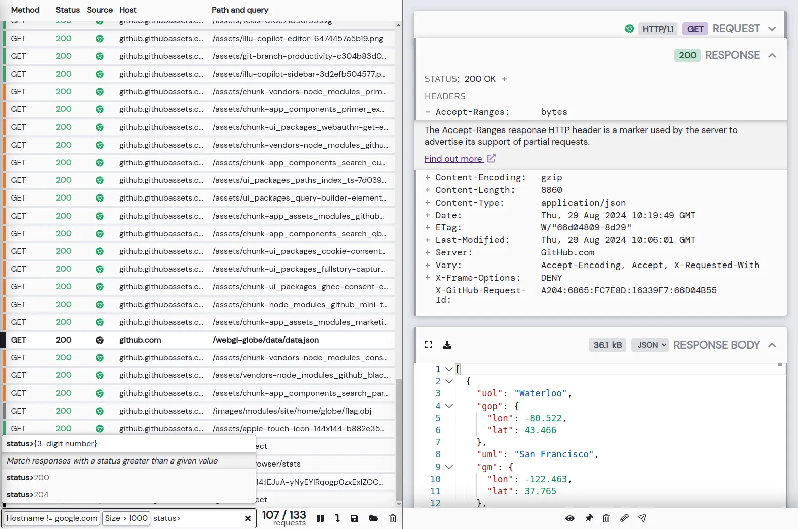 Examine the URL, status, headers & body of each message, with built-in parsing of parameters, and explanations & docs from MDN for all standard headers.