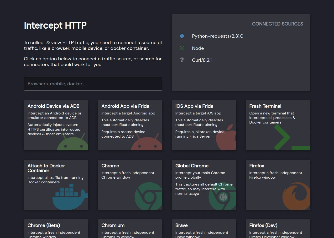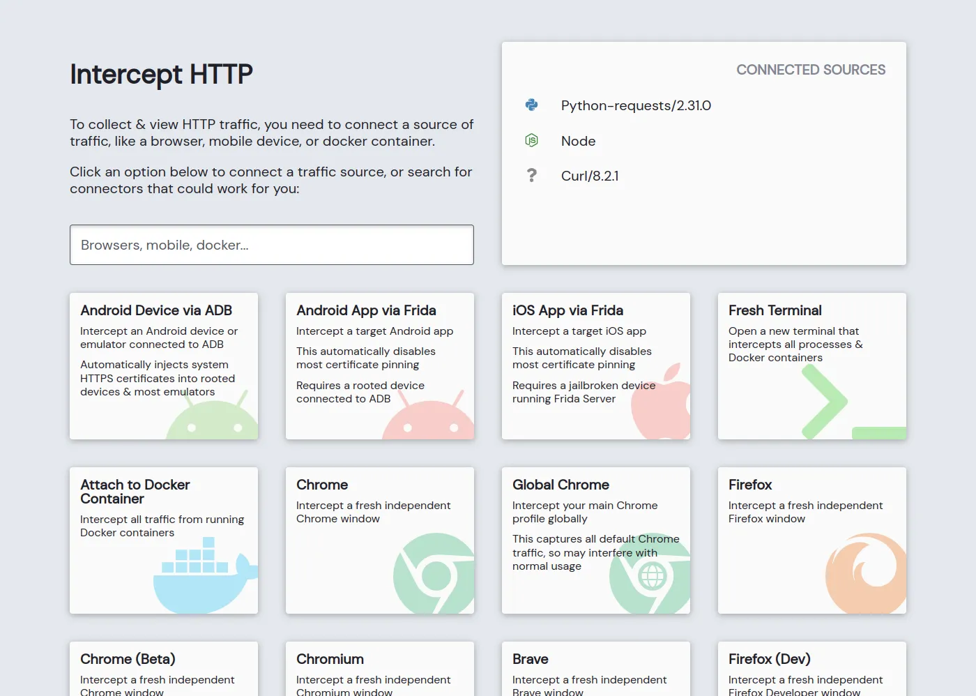 Intercept individual Android or iOS apps, entire devices, Docker containers, browser windows, backend processes like Node.js, Java, Python or Ruby, terminal sessions...