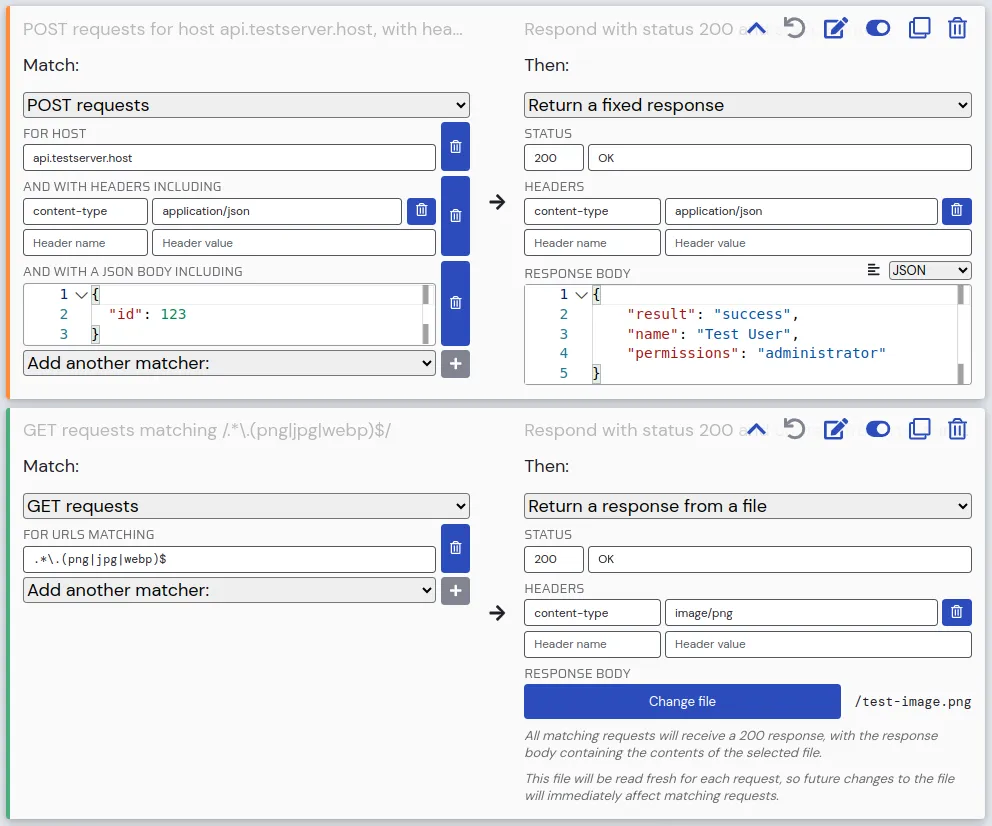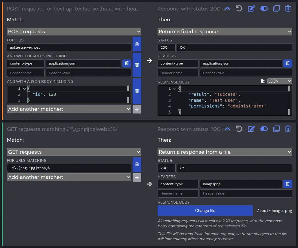 Precisely match interesting requests, then define your own static response or map local files, to test clients against any endpoint behaviour you can imagine. Use it to override real responses, or even to simulate responses from endpoints or entire servers that don't exist yet.