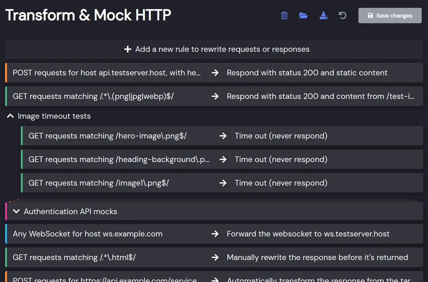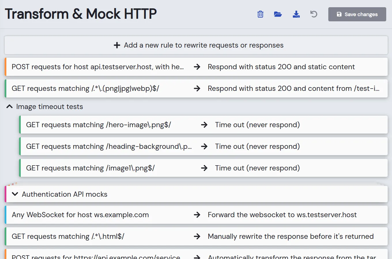 Create rules in one click from intercepted traffic, tune to perfection, then use rule groups & custom aliases to quickly organize rules and toggle behaviours. Once they're perfect, export rules to share with your team or store as your own private library.
