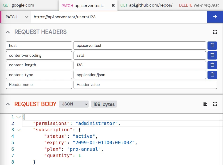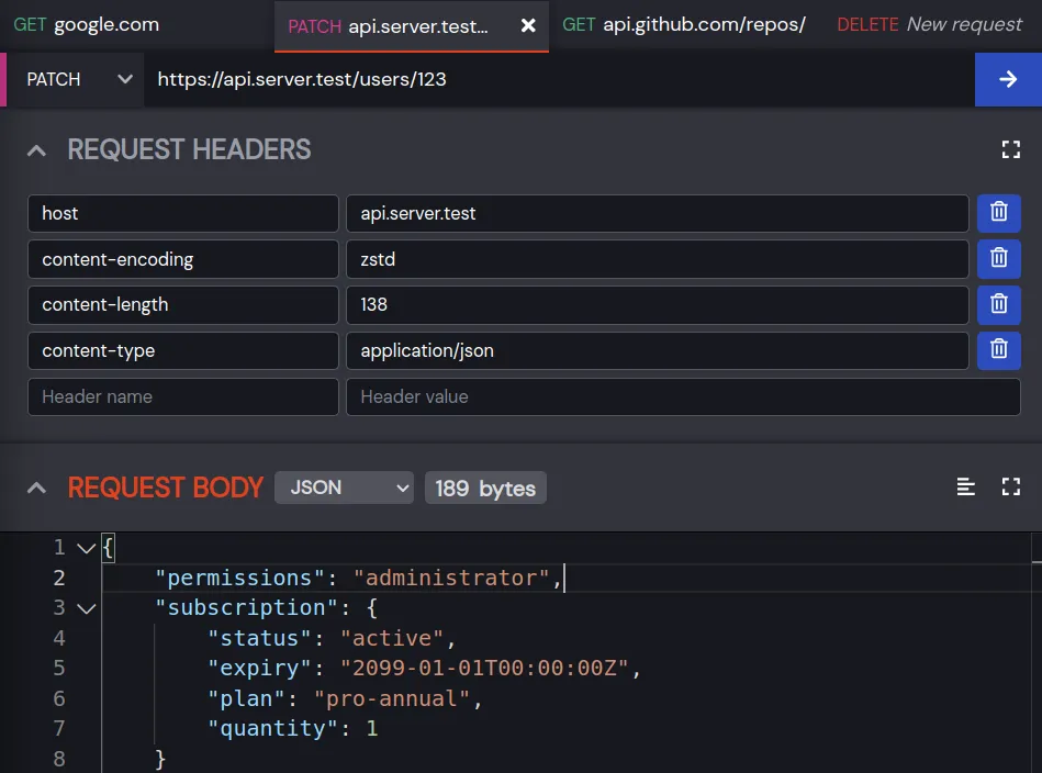 Use the fully featured HTTP client to define every aspect of your request, with automatic handling of details like body compression and message framing.